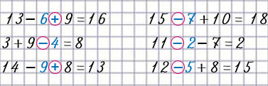 Вставь в кружки знак действия «+» или «-» заполни пропуски такими числами, чтобы получились верные равенства.