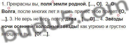 1. Прекрасны вы поля земли родной. (М. Лермонтов) 2. О Волга после многих лет я вновь принёс тебе привет. (Н. Некрасов) 3. Не верь не верь поэту дева... (Ф. Тютчев) 4. Звёзды ночи осенней холодные звёзды как угрюмо и грустно мерцаете вы. (И. Бунин)