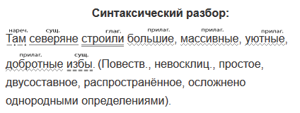 В наиболее чистом виде русское деревянное зодчество сохранилось на севере России. Там северяне2 строили большие, массивные, уютные, добротные избы.4 Стоит такая изба лицом к проезжей дороге, реке или озеру. Она поблёскивает на солнце высоко поднятыми над землёй окнами. Под её кровом жили деды, отцы, сыновья и внуки. Простая деревенская изба. (Грамматическая основа состоит только из подлежащего)