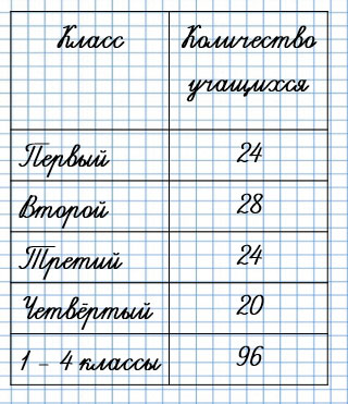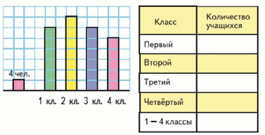 86. По последнему столбику на диаграмме определи масштаб, в котором она построена. Начерти такую таблицу в тетради. Используя данные диаграммы, запиши, сколько учащихся в каждом классе и во всех четырёх классах.