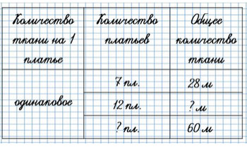 10. Из 28 м ткани сшили 7 одинаковых платьев. Сколько потребуется ткани, чтобы сшить 12 таких платьев? Сколько таких платьев можно сшить из 60 м ткани?