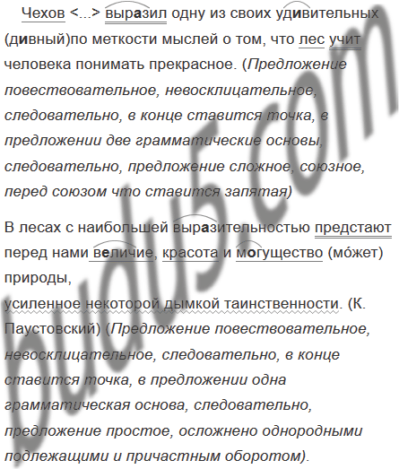 Чехов <...> выр..зил одну из своих уд..вительных по меткости мыслей о том, что лес учит человека понимать прекрасное. В лесах с наибольшей выразительностью предстают перед нами в..личие красота и м..гущество природы усиленное некоторой дымкой таинственности. (К. Паустовский)