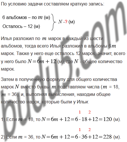 Илья разложил по марок в каждый из шести альбомов, и еще 12 марок у него осталось. Составьте формулу для вычисления количества марок, которые есть у Ильи, и вычислите это количество, если: 1) = 18; 2) = 36.