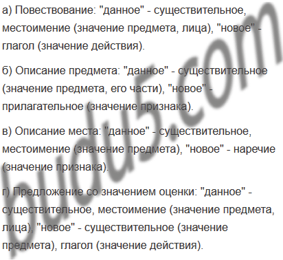 Сделайте вывод, слова с каким значением обычно являются «данным» и стоят в начале предложений, с каким— «новым» и стоят в конце предложений: а) в повествовании; б) в описании предмета; в) в описании места; г) в предложениях со значением оценки.