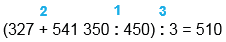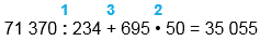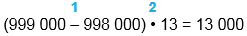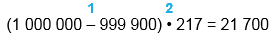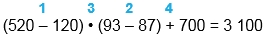 1) 520 - 120 = 400 2) 93 - 87 = 6 3) 400 • 6 = 2 400 4) 2 400 + 700 = 3 100 | |||||||||||||||||||