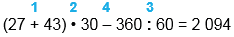 1) 27 + 43 = 70 2) 70 • 30 = 2 100 3) 360 : 60 = 6 4) 2 100 - 6 = 2 094