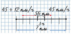 7. От двух станций, расстояние между которыми 56 км, отошли одновременно в противоположных направлениях два поезда. Скорость одного поезда 45 км/ч, а скорость другого на 12 км/ч больше. Какое расстояние будет между этими поездами через 3 ч? через 10 ч?