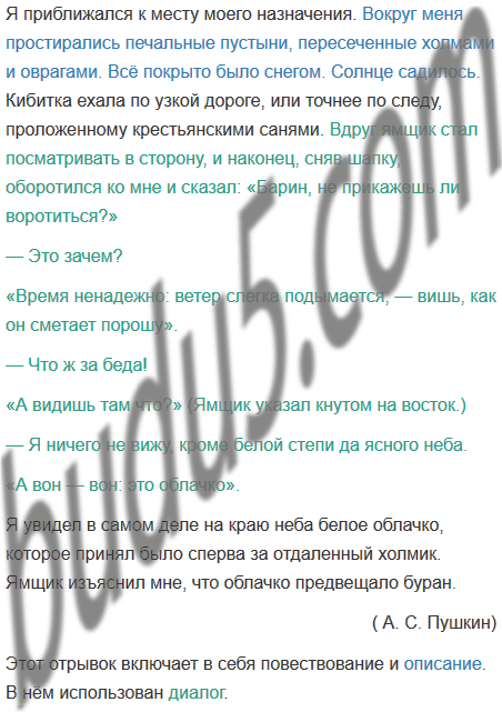 Прочитайте фрагмент лз повести А. С. Пушкина «Капитанская дочка» (глава II, от слов «Я приближался к месту моего назначения...» до слов «Ямщик изъяснил мне, что облачко предвещало буран»). Охарактеризуйте этот текст, указав разновидности речи, которые в нём использованы.