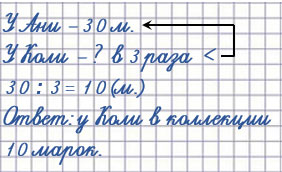 У Ани в коллекции 30 марок, а у Коли в 3 раза меньше. Сколько марок в коллекции у Коли?