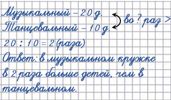 В музыкальный кружок ходит 20 детей, а в танцевальный - 10 детей. Во сколько раз в музыкальном кружке больше детей, чем в танцевальном?