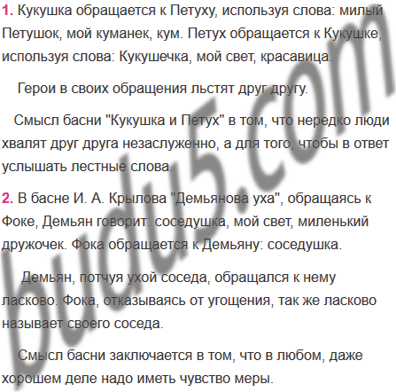 1. Внимательно прочитайте басню И. А. Крылова «Кукушка и Петух». Выпишите слова, с которыми Кукушка обращается к Петуху, а затем обращения к Кукушке. В чём особенность этих обращений? Как они характеризуют героев басни, их взаимоотношения? Выразительно прочитайте басню, объясните её смысл.