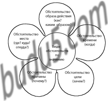 Описание схемы: цветок; в центре написано: виды обстоятельств по значению; 5 лепестков: на 1-м — обстоятельство образа действия (как? каким образом?), на 2-м — обстоятельство места (где? куда? откуда?), на 3-м — обстоятельство времени (когда?), на 4-м — обстоятельство причины (почему?), на 5-м — обстоятельство цели (зачем?).