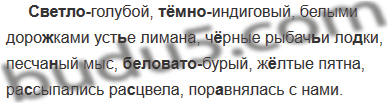 (Светло)голубой, (тёмно)индиговый, белыми доро..ками уст(?)е лимана, ч..рные рыбач(?)и ло..ки, песча..ый мыс, (беловато)бурый, ж..лтые пятна, ра..сыпались ра..цвела, пор..внялась с нами.