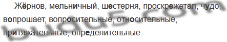 Ж..рнов, мельн..чный, ш..стерня, проскр..жетал, ч..до, в..прошает, вопр..сительные, отн..сительные, пр..тяжательные, опр.. делительные.