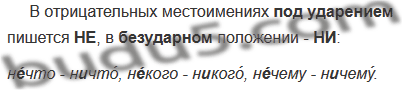 | 1. Ничто́ не нарушало тишины. 2. Дома никого́ не было. 3. Ничему́ не удивляйтесь. | 1. Мы увидели не́что необычное. 2. Больше ждать было не́кого. 3. Удивляться было не́чему. |
