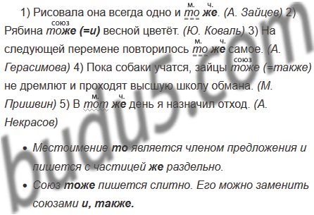 1) Рисовала она всегда одно и то(же). (А. Зайцев) 2) Рябина то(же) весной цветёт. (Ю. Коваль) 3) На следующей перемене повторилось то(же) самое. (А. Герасимова) 4) Пока собаки учатся, зайцы то(же) не дремлют и проходят высшую школу обмана. (М. Пришвин) 5) В тот(же) день я назначил отход. (А. Некрасов)