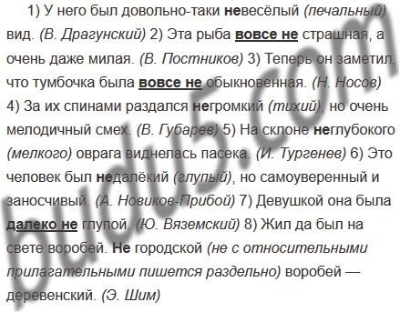 1) У него был довольно-таки (не)весёлый вид. (В. Драгунский) 2) Эта рыба вовсе (не)страшная, а очень даже милая. (В. Постников) 3) Теперь он заметил, что тумбочка была вовсе (не)обыкновенная. (Н. Носов) 4) За их спинами раздался (не)громкий, но очень мелодичный смех. (В. Губарев) 5) На склоне (не)глубокого оврага виднелась пасека. (И. Тургенев) 6) Это человек был (не)далёкий, но самоуверенный и заносчивый. (А. Новиков-Прибой) 7) Девушкой она была далеко (не)глупой. (Ю. Вяземский) 8) Жил да был на свете воробей. (Не)городской воробей — деревенский. (Э. Шим)
