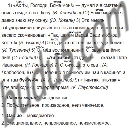 1) «Ах ты, Господи, Боже мой!» — думал я в смятении, боясь гл..деть на Любу. (В. Астафьев) 2) Боже мой, да я давно знаю эту осину. (Ю. Коваль) 3) Эта мысль взбудоражила приунывшего было командира, и он почти весело скомандовал: «Так, шагом марш! Веди в обход, Костя!» (В. Быков) 4) Эге, да это я со..сем не туда попал! (И. Тургенев) 5) О, мёд воспоминаний! О, звон д..лёких лип! (С. Есенин) 6) «(Ай)(ай)(ай)! Стыдись!» — сказал Пётр Иванович. (Н. Гончаров) 7) Ого (го), да это хват. (А. Грибоедов) 8) Обыкновенно я принесу им чай в кабинет, а они там (бу)(бу)(бу). (А. К. Толстой) 9) «Тик(так), тик(так)!» — стучали ходики, отмеряя время. (К. Паустовский)