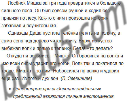 Лосёнок Мишка за три года превратился в большого сильного лося он был совсем ручной и ходил без привязи по лесу как-то с ним произошла история забавная и поучительная однажды Даша пустила телёнка гулять на поляну а сама села под дерево читать книгу вдруг из кустов выбежал волк и прямо к телёнку беда что делать откуда ни возьмись Мишка он бросился на волка и изо всей силы ударил его ногой волк так и покатился по траве Мишка за ним набросился на волка и ударил ещё раз из того и дух вон. (В. Звегинцев)