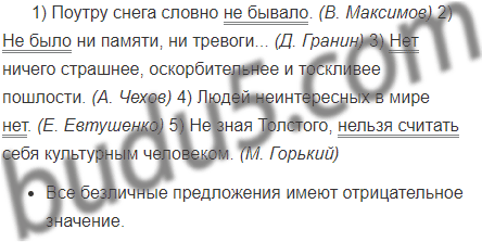 1) Поутру снега словно не бывало. (В. Максимов) 2) Не было ни памяти, ни тревоги... (Д. Гранин) 3) Нет ничего страшнее, оскорбительнее и тоскливее пошлости. (А. Чехов) 4) Людей неинтересных в мире нет. (Е. Евтушенко) 5) Не зная Толстого, нельзя считать себя культурным человеком. (М. Горький)