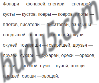 Фонари — фонарей, снегири, кусты, ковры, плоты, писатели, ландыши, тюлени, окуни, товарищи, друзья, сухари, орехи, ясени, лучи, плащи, овощи.