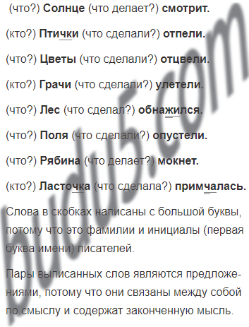 1. Но птички отпели. Цветы отцвели. (Ф. Тютчев) 2. Грачи улетели. Лес обнажился. Поля опустели. (Н. Некрасов) 3. Чахлая рябина мокнет под окном. (А. Плещеев) 4. Ласточка примчалась из-за бела моря. (А. Майков)